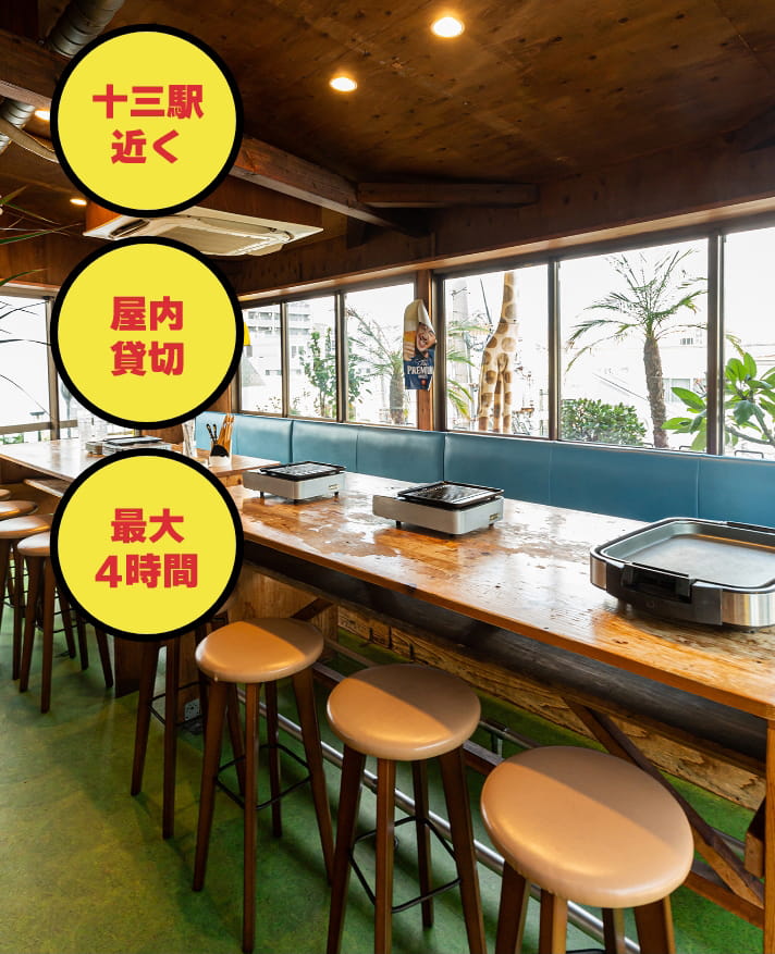 大阪十三駅近くにある「大人の秘密基地BBQ」では、完全貸切だから周りを気にせず最大5時間思いっきりお楽しみいただけます!屋内だから雨の日でも問題なし!地元の焼肉屋「まるたけ」が運営しているから、まあまあええ肉ご用意します!ドリンクや食材の持ち込みも自由!自分たちだけのプライベート空間で最高の時間を楽しんでみませんか?
